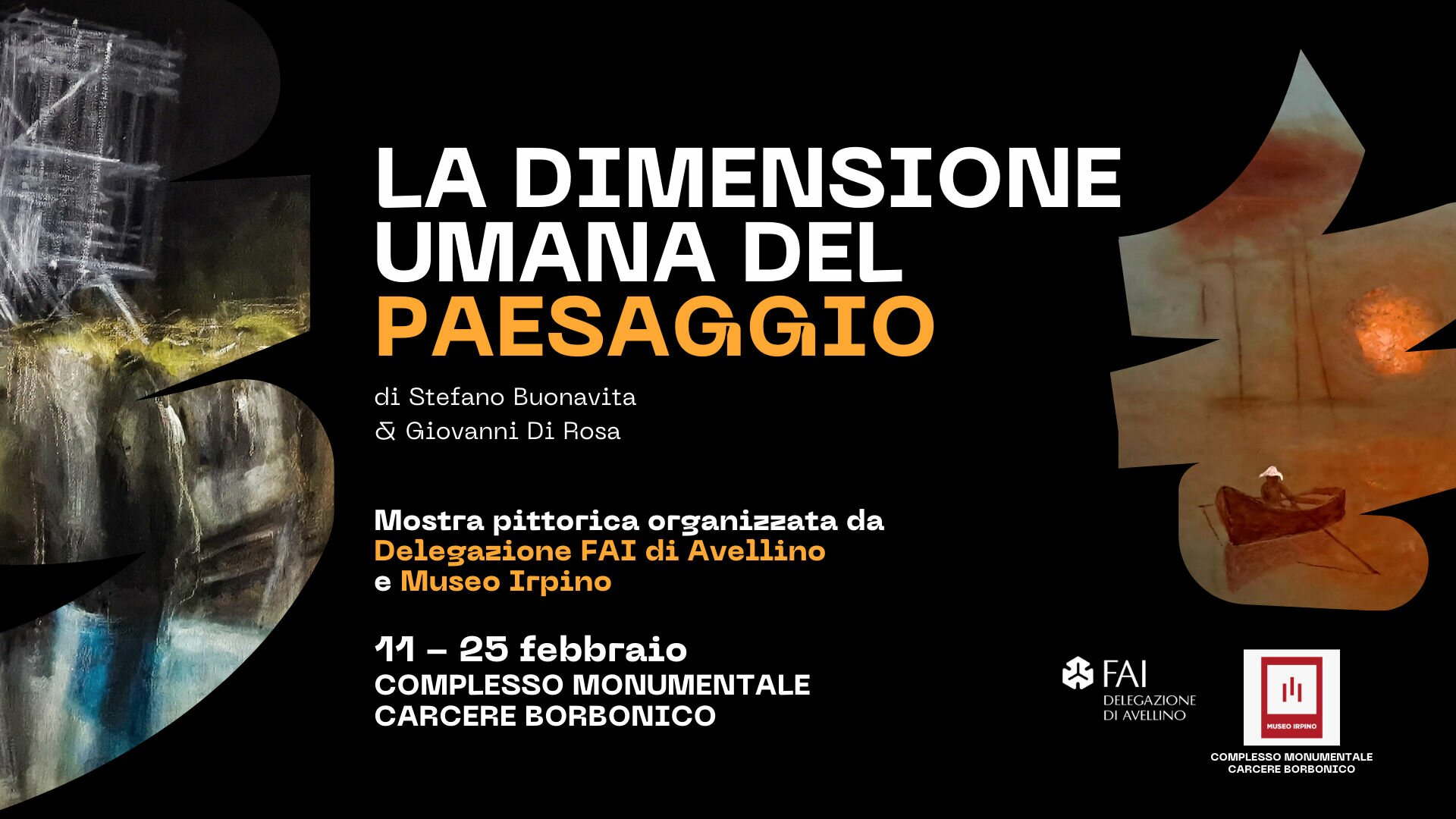 La Delegazione FAI di Avellino, in collaborazione con il Museo Irpino, organizza la mostra pittorica “La dimensione umana del paesaggio”, con gli artisti Stefano Buonavita e Giovanni Di Rosa. La mostra si svolgerà dall’11 al 25 febbraio 2023 presso le sale espositive del Museo irpino, nella suggestiva sede del Carcere borbonico di Avellino.