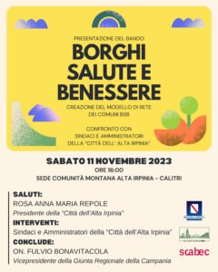 La riunione porrà al centro dell’attenzione la presentazione dell’Avviso pubblico di SCABEC (Società Campana per la Biodiversità e l’Ecosostenibilità) intitolato “Creazione del modello di rete dei comuni BSB – Borghi Salute e Benessere”: un programma che mira a promuovere la salute e il benessere nei borghi delle aree interne, sostenendo la cooperazione e la sinergia tra i comuni coinvolti.
