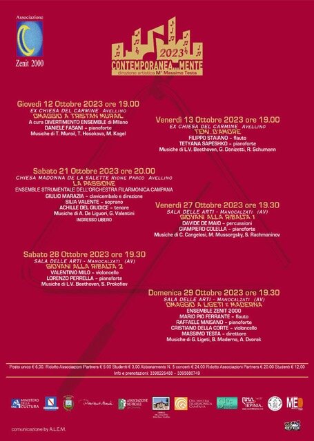 Ultimi tre eventi della Rassegna CONTEMPORANEA…MENTE con la quale l’ASSOCIAZIONE ZENIT 2000, presieduta dal M° Massimo Testa, ha proposto all’affezionato e competente pubblico irpino il consueto sguardo alla musica classica e alle tematiche contemporanee.