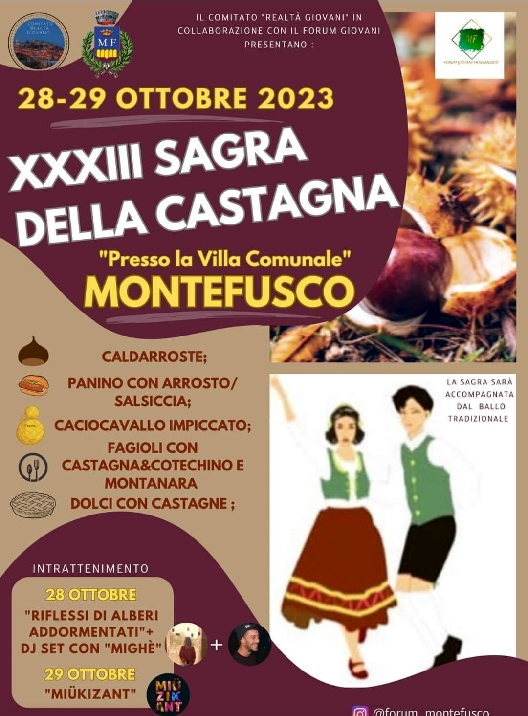 Il paese, famoso per le sue tradizioni e festività, durante l’anno ospita eventi culturali, sagre e feste religiose che attirano visitatori da tutto il mondo. Una di queste è l’attesissima Sagra della Castagna giunta alla sua 33esima edizione. L’evento, organizzato dal Comitato Realtà Giovani in collaborazione con il Forum dei Giovani di Montefusco, si terrà sabato 28 e domenica 29 Ottobre 2023.