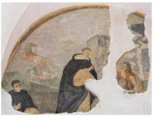 Avviati i lavori di messa in sicurezza e consolidamento di un dipinto murale all’interno del Chiostro comunale di Montemiletto, Storie domenicane, sec. XVIII, affresco dipinto olio e tempera.
