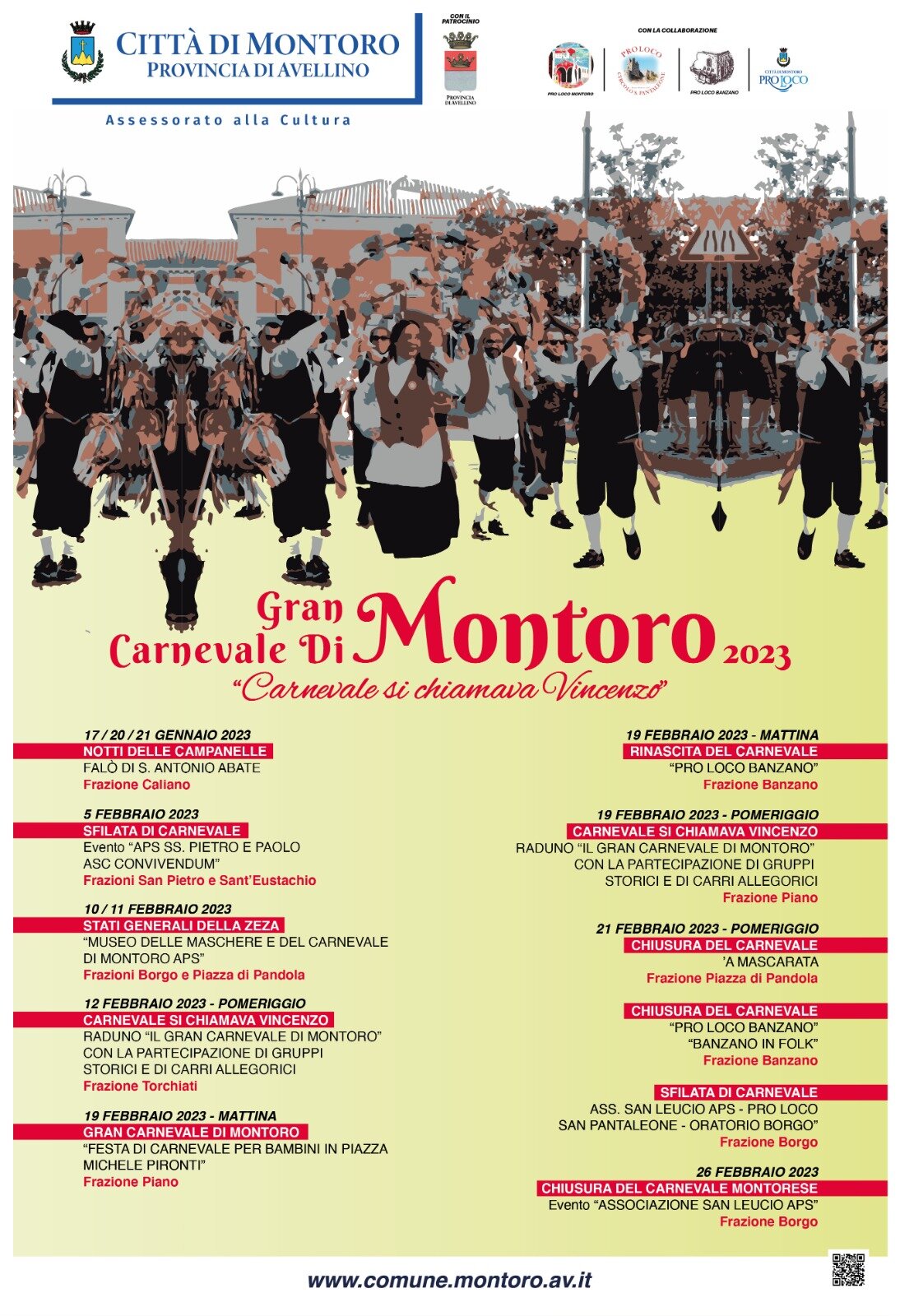 L’intenso e fitto programma trova il culmine il 12 ed il 19 febbraio a partire dalle ore 15.00 con i raduni del “GRAN CARNEVALE DI MONTORO” con la partecipazione di gruppi storici locali e delle altre realtà della Campania unitamente a carri allegorici provenienti dalla Valle dell’Irno.