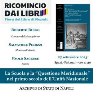 Sabato 23 settembre riflettori puntati sul volume “La Scuola e la Questione Meridionale nel primo secolo dell’Unità Nazionale” a cura del Prof. Saggese Paolo nell’incontro programmato alle 17.30 nello Spazio Palomar.