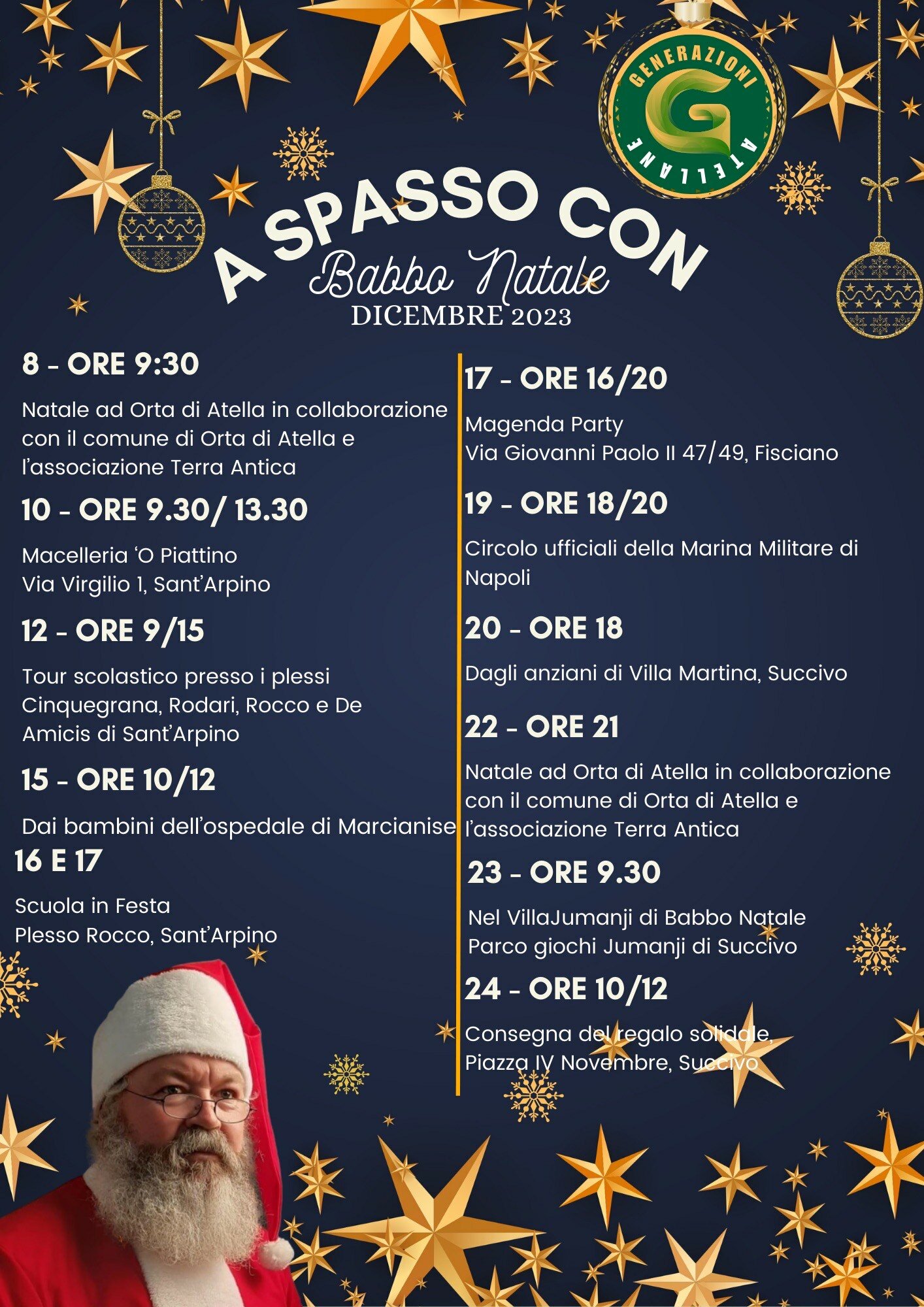 Domenica 10 Dicembre sarà la volta della Macellaria “O piattino” in zona Castellone, il 12 invece ci sarà un vero e proprio tour durante il quale Babbo Natale farà visita a tutti gli studenti di scuola dell’infanzia e primaria dell’istituto comprensivo “Rocco-Cav. Cinquegrana” di Sant’Arpino. Il 16 e 17 avremo il piacere, ma soprattutto l’onore, di collaborare con “Scuola in Festa Christmas Edition”.