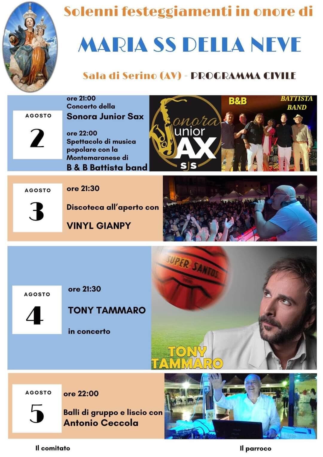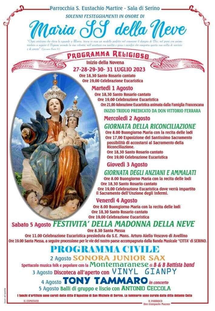 Tutto pronto per i festeggiamenti in onore di Santa Maria della Neve, che si terrà da stasera, mercoledì 2 a sabato 5 Agosto 2023, a Serino.