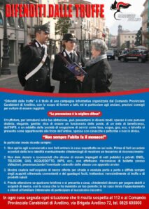Si ricordano ancora una volta gli utili consigli diffusi con l’iniziativa “Difenditi dalle truffe”, del Comando Provinciale dei Carabinieri di Avellino. È importante saper riconoscere le situazioni più a rischio e, di conseguenza, i comportamenti da assumere, diffidando sempre degli acquisti oltremodo convenienti, trattandosi verosimilmente di una truffa o di prodotti di provenienza illecita.